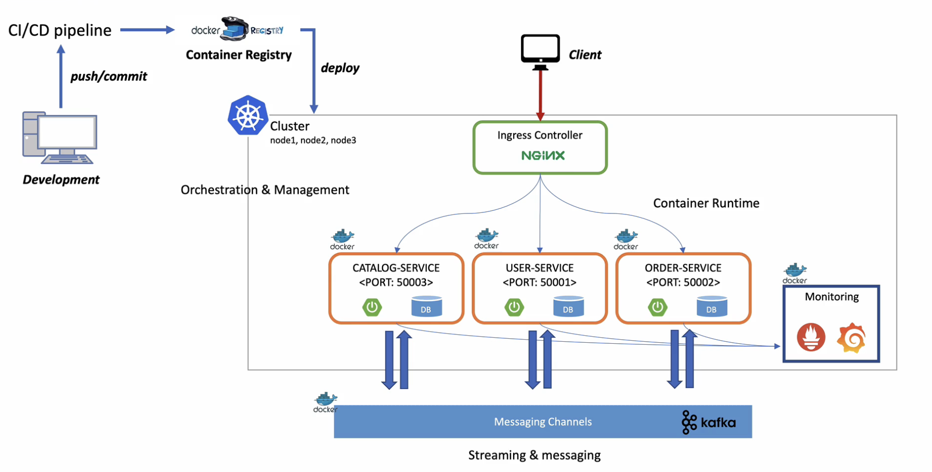 쿠버네티스 컨테이너 가상화 기술로 오케스트레이션 할 수 있습니다. 3가지 마이크로 서비스를 모니터링하기 위해서 Grafana 혹은 Prometeus같은 서비스를 연동시킬 수 있습니다.