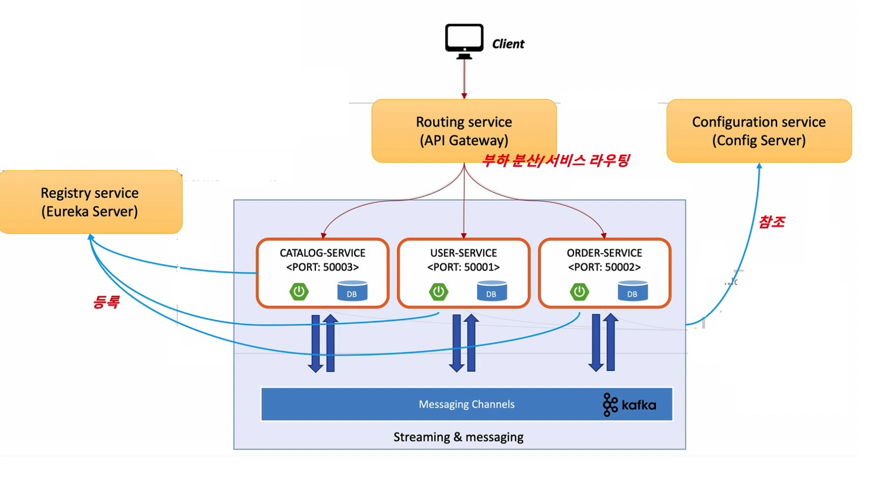 - 서비스 간의 데이터 공유나 이벤트 처리는 Kafka를 통해 비동기적으로 처리됩니다.