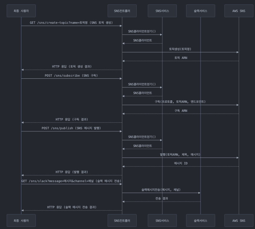 - SNS 서비스를 통해 AWS SNS와 통신하여 토픽을 생성하고 토픽 ARN을 반환받습니다.