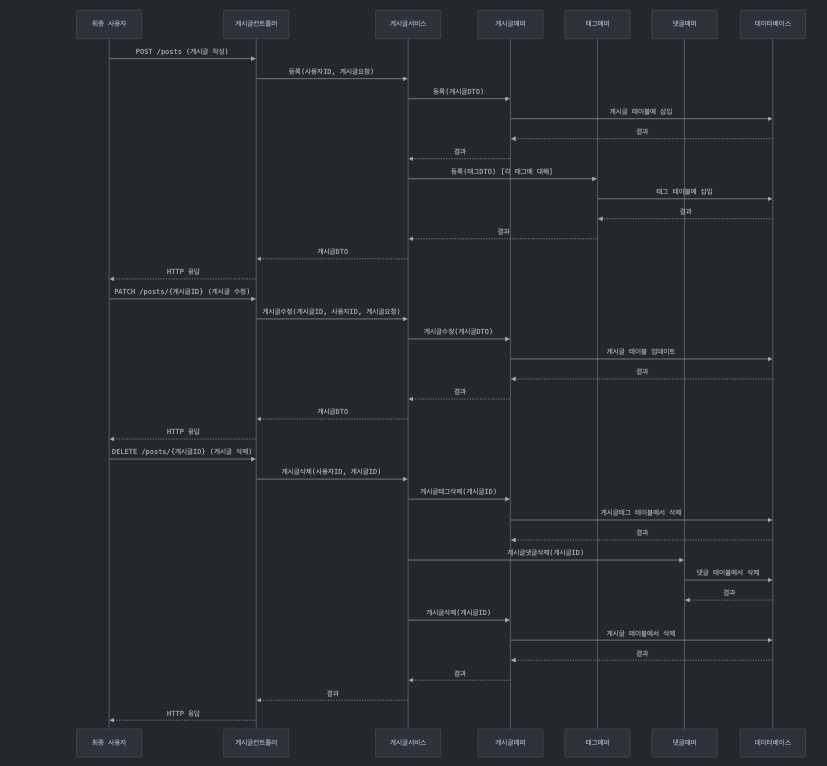 - 게시글 삭제 (DELETE /posts/{게시글ID}): 게시글을 삭제하며, 관련된 태그와 댓글도 함께 삭제합니다.
