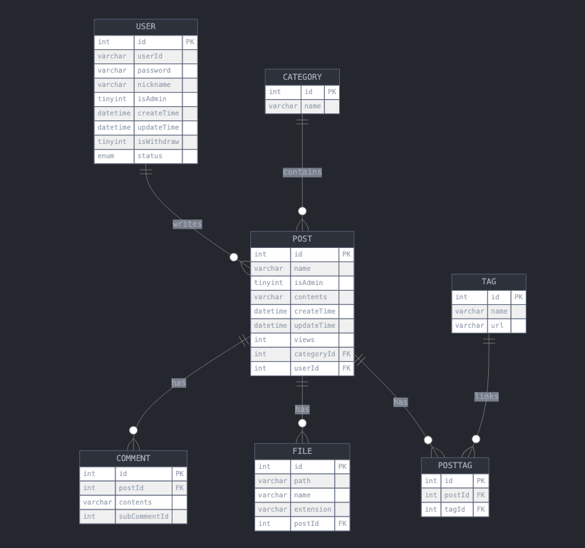 - USER와 CATEGORY 테이블과 관계가 있으며, COMMENT, FILE, POSTTAG 테이블과도 관계가 있습니다.