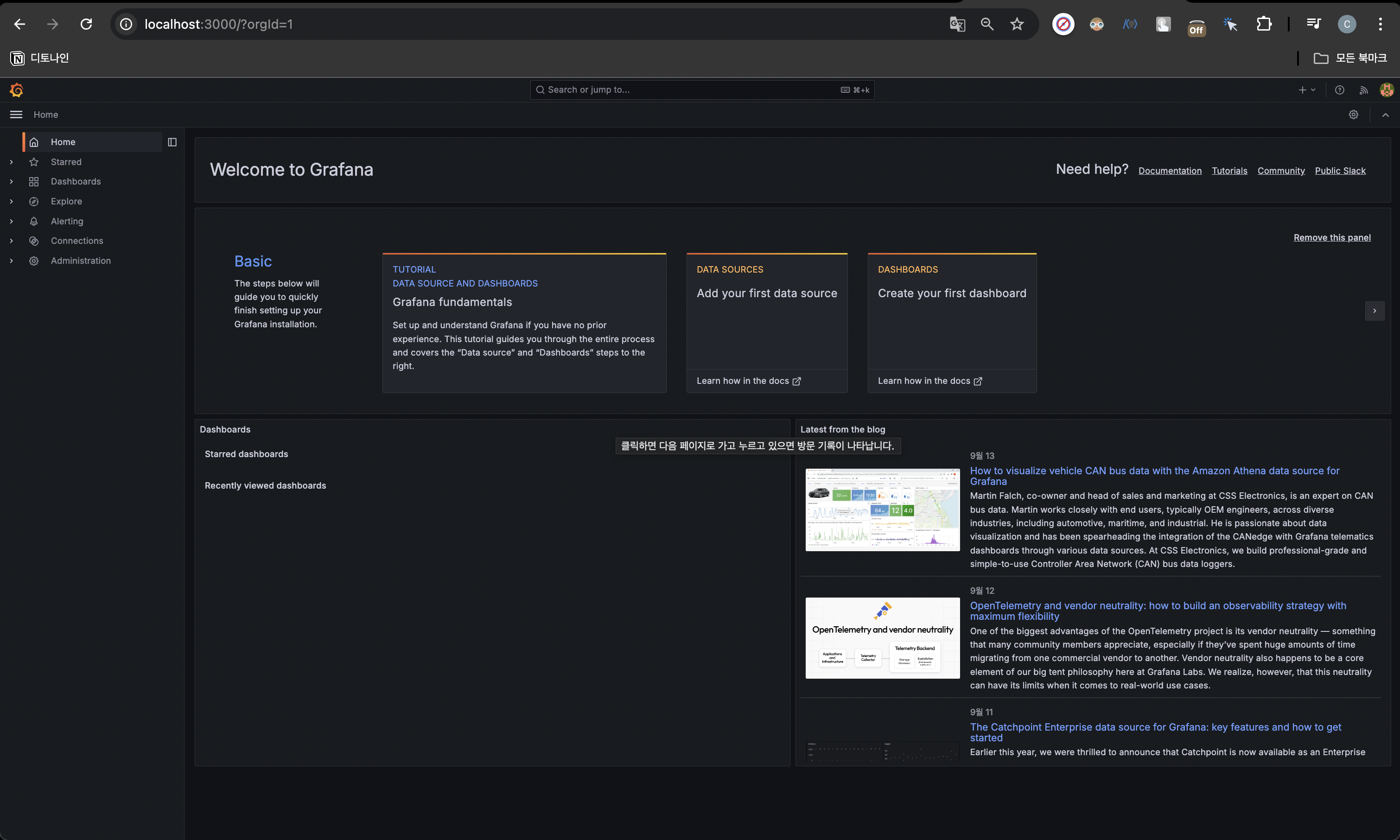 그라파나의 첫 홈 화면에서 DATA SOURCES가 있는 버튼을 눌러줍니다.(바로 위 이미지)