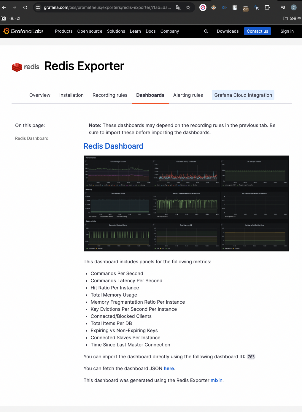 해당 링크로 가서 You can fetch the dashboard JSON here을 클릭하면 설정 정보를 다운받을 수 있습니다.