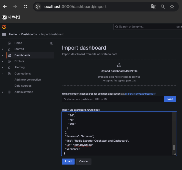 그라파나 화면으로 가서 우측 상단의 + 버튼을 클릭하고 Import dashboard를 클릭합니다.