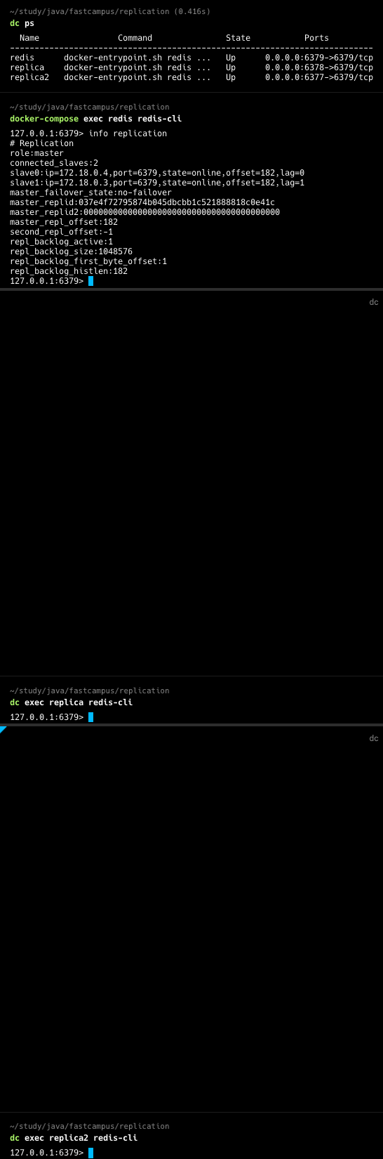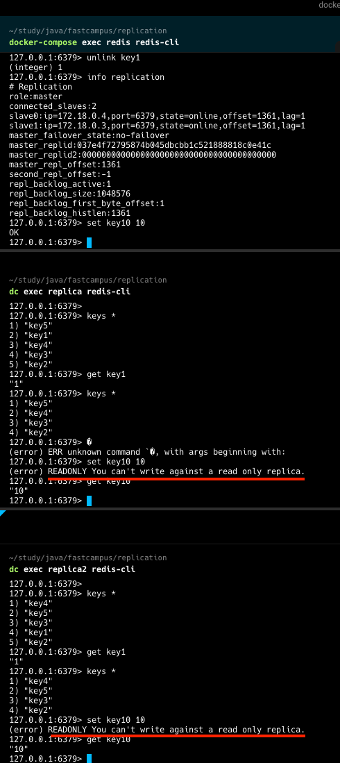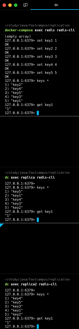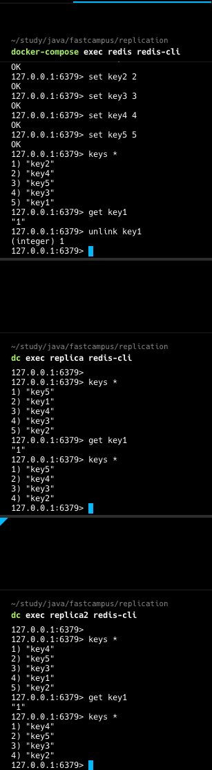 가장 위쪽이 현재 마스트 redis-cli이며 아래는 replica, replica2로 접속한 상태입니다.