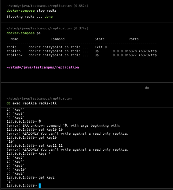 그럼 입력한 redis는 replica으로 설정 됩니다. 이후 replica는 read-only로 동작하게 됩니다.