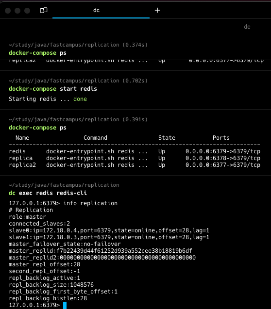 마스터 노드를 재기동하여 원상복구 시켜보며 info replication 명령어를 통해 동기화 되었는지 확인해 보겠습니다.
