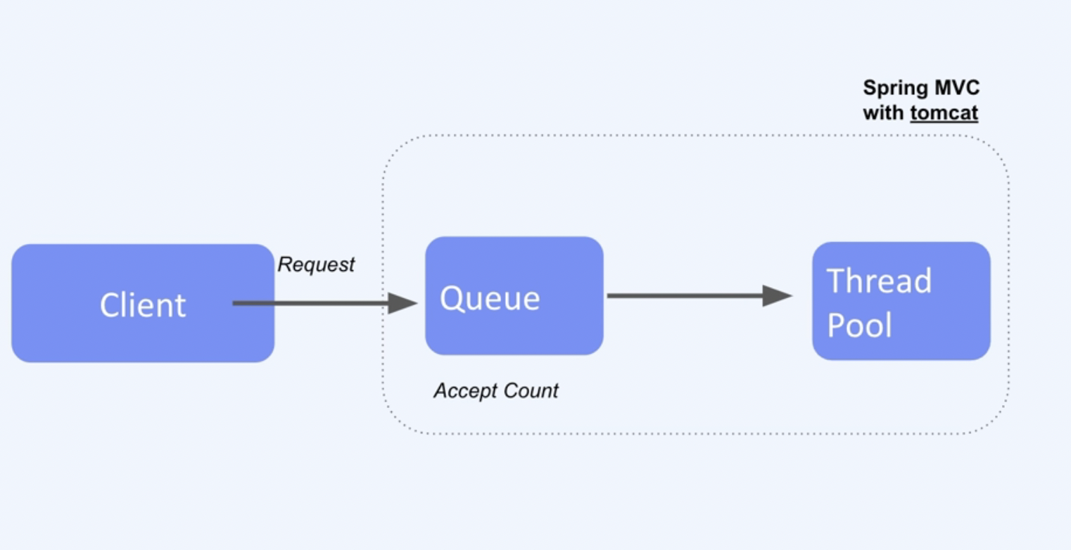 클라이언트의 HTTP 요청을 Queue에 넣게 됩니다. 그리고 Thread Pool에 요청에 대한 응답을 위한 미리 만들어진 쓰레드를 꺼내다 쓰게 됩니다. 너무 많은 요청이 오게 되면 쓰레드풀에서 쓰레드가 모두 사용되게 됩니다. 그리고 Queue까지 가득 차게 되면 더이상 처리하지 못하게 되므로 HTTP Request는 실패처리하게 됩니다.