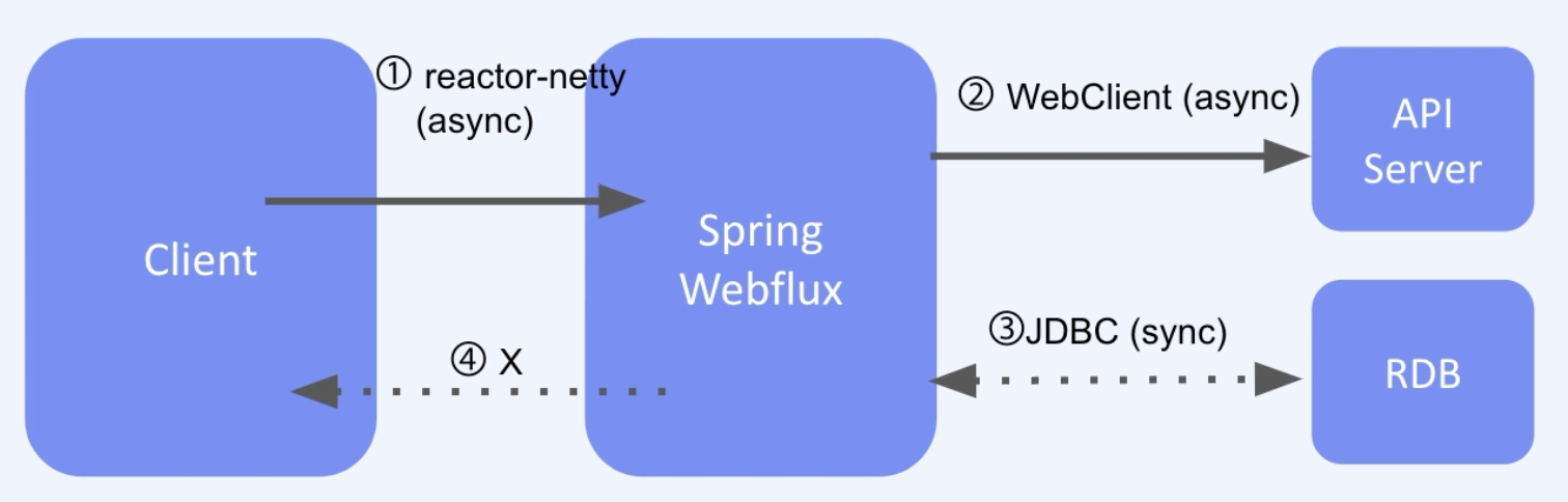 - Spring WebFlux는 클라이언트와의 통신, API 서버와의 통신에서는 비동기적 처리 방식을 사용하지만, JDBC는 동기적 방식으로 RDB에 접근하여 이 부분에서 블로킹이 발생할 수 있습니다.