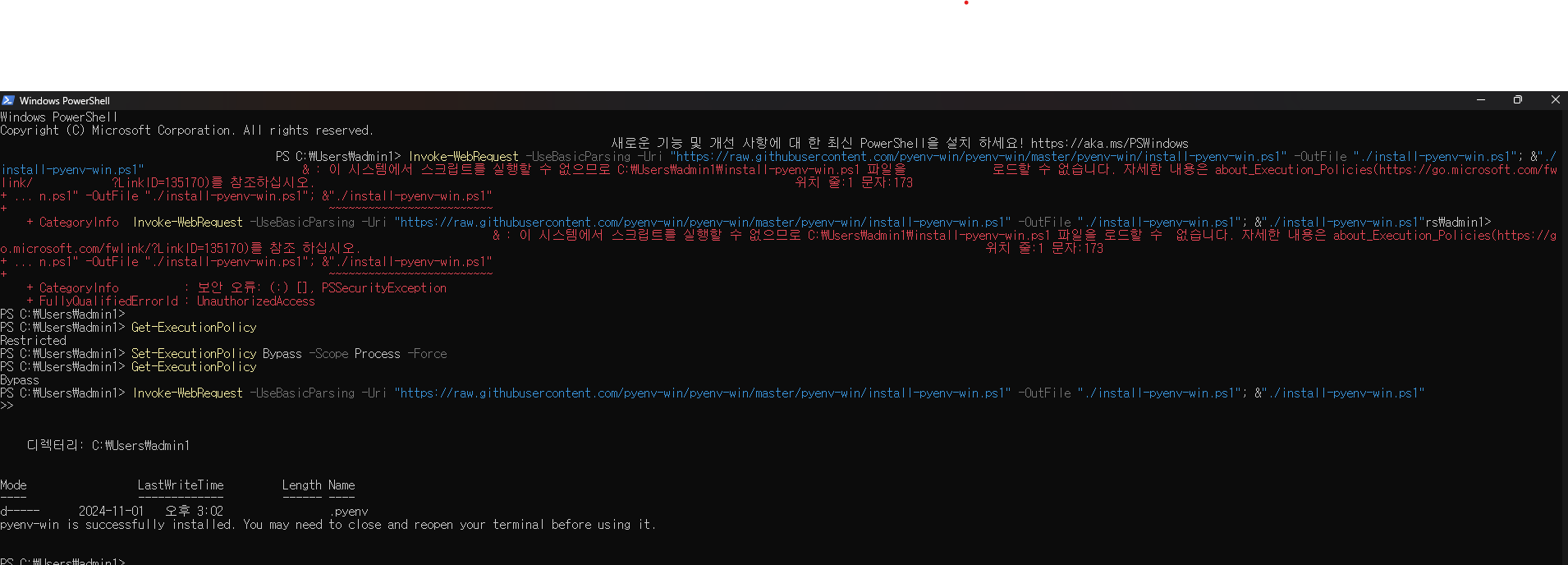 & : 이 시스템에서 스크립트를 실행할 수 없으므로 C:\Users\admin1\install-pyenv-win.ps1 파일을 로드할 수 없습니다. 자세한 내용은 about_Execution_Policies(https://go.microsoft.com/fwlink/?LinkID=135170)를 참조하십시오.