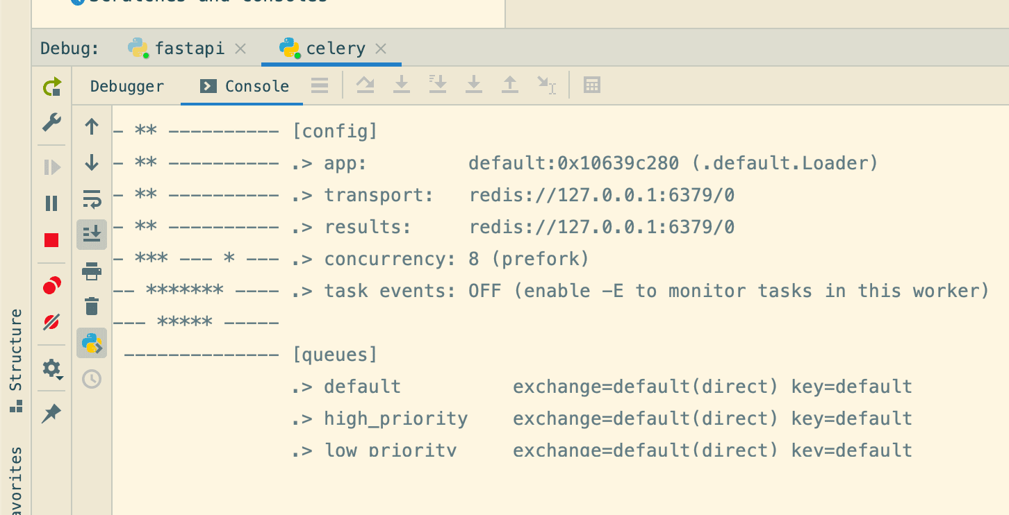 - PyCharm 하나의 IDE에서 FastAPI 앱과 Celery 태스크를 모두 디버깅할 수 있습니다.