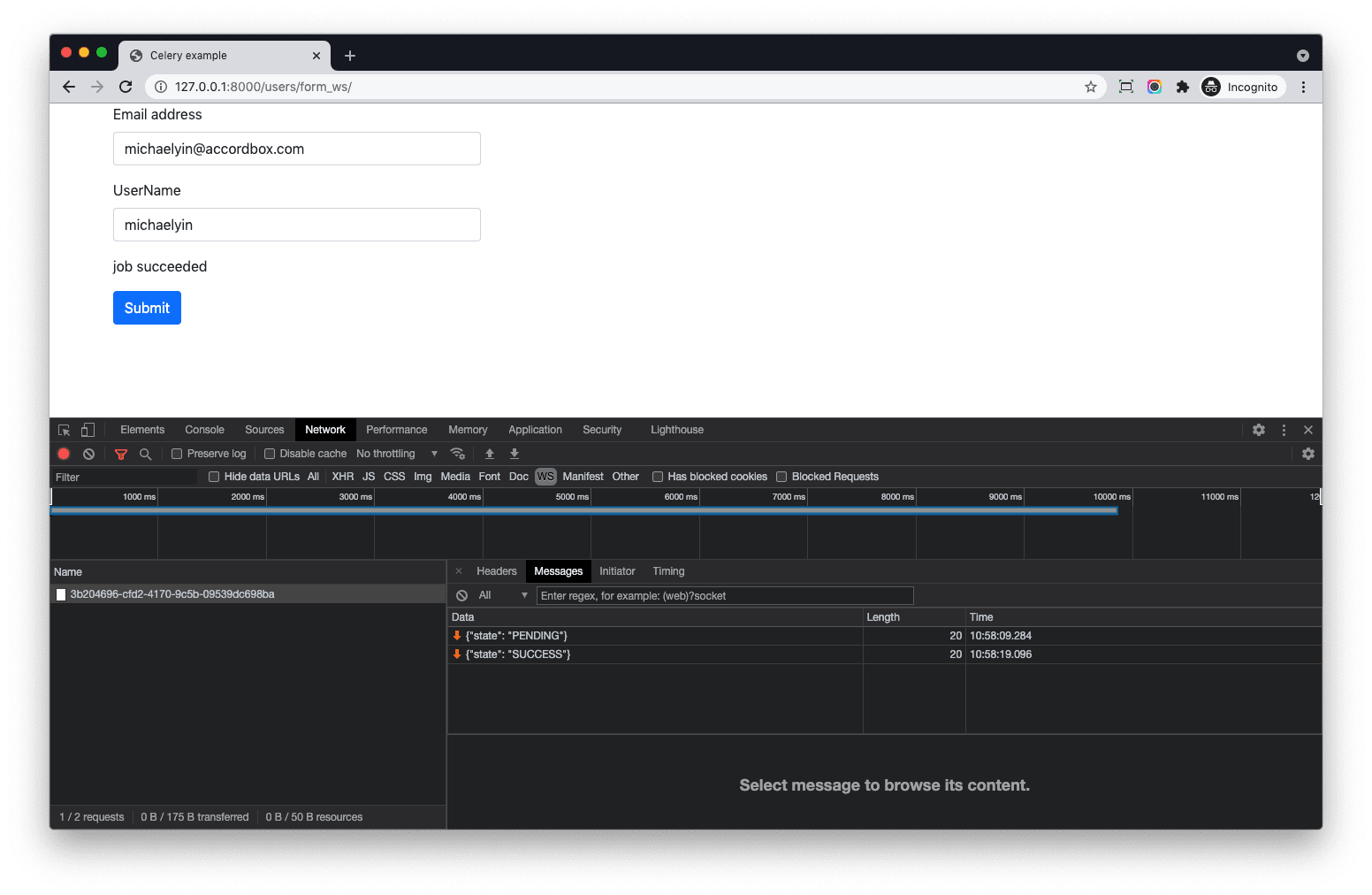 http://localhost:8010/users/form_ws/ 를 브라우저 주소창에 입력하고 랜덤한 이름과 이메일을 입력한 이후 submit버튼을 클릭합니다.