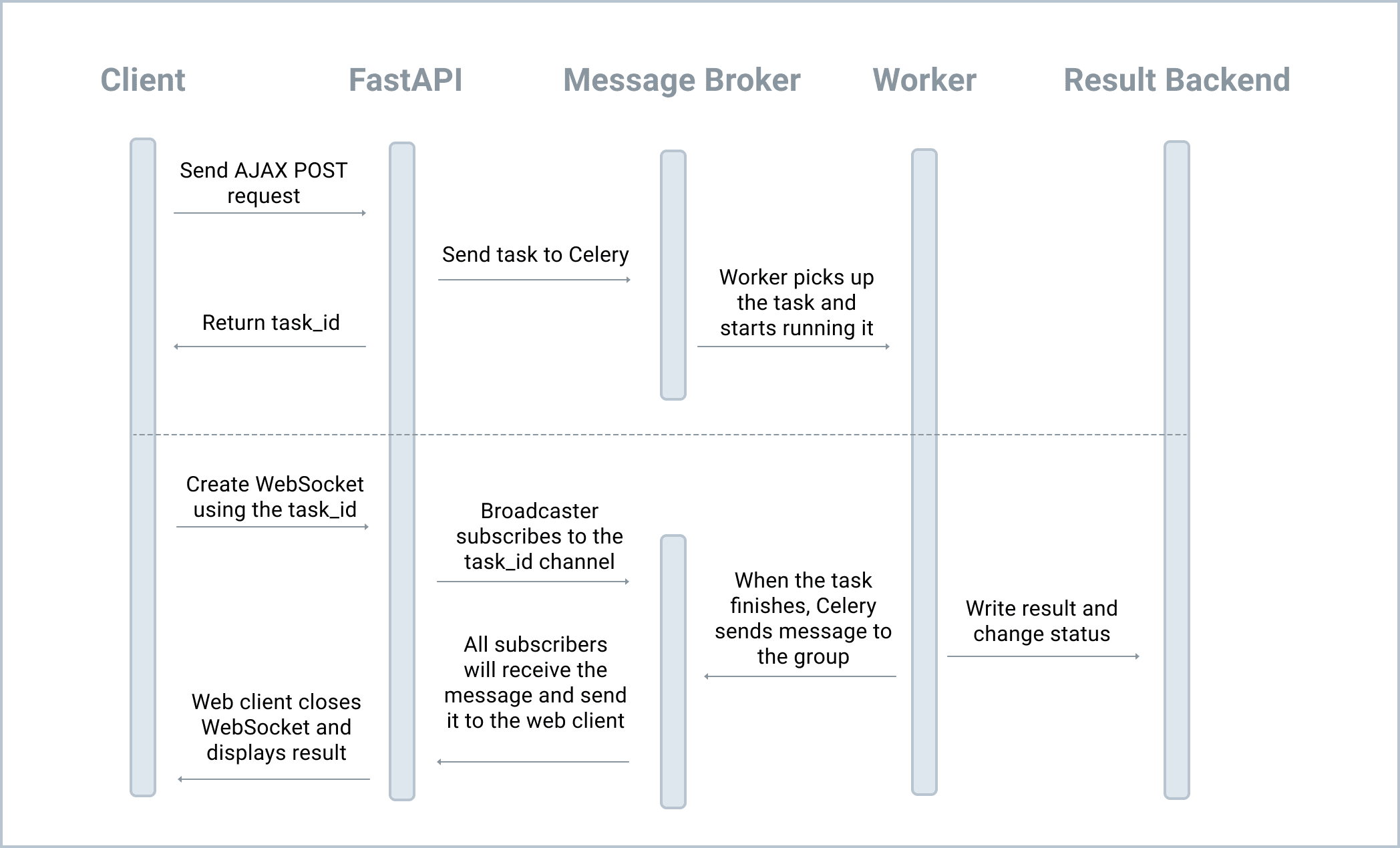 이 시나리오는 FastAPI, Celery, 그리고 WebSocket을 사용하여 비동기 태스크의 상태 업데이트를 실시간으로 클라이언트에 전달하는 과정을 설명합니다. 각 단계별로 자세히 살펴보겠습니다.